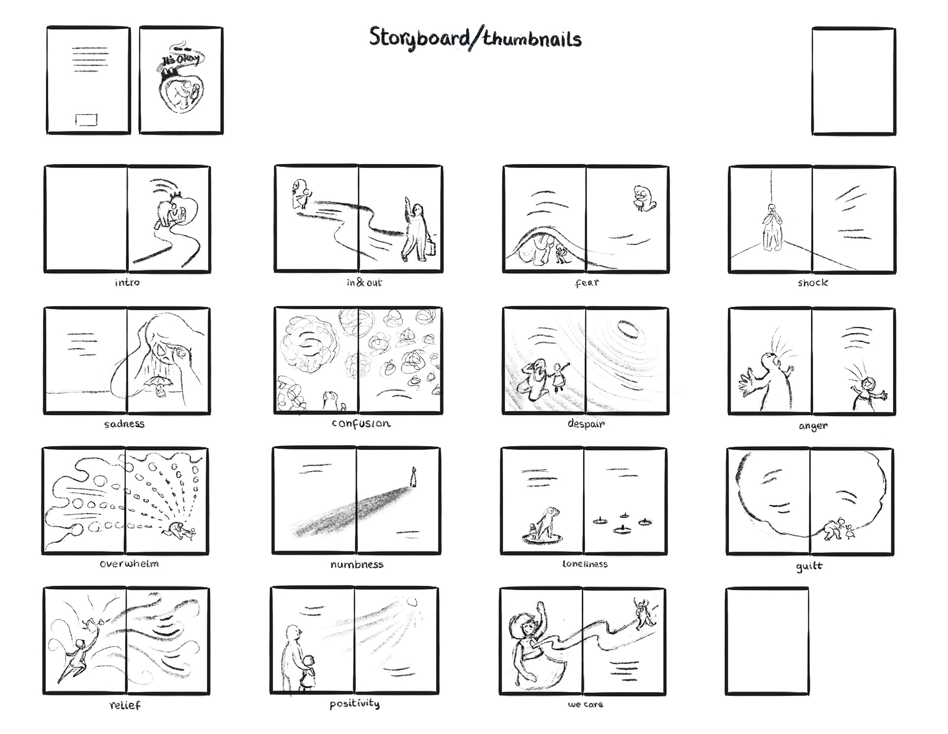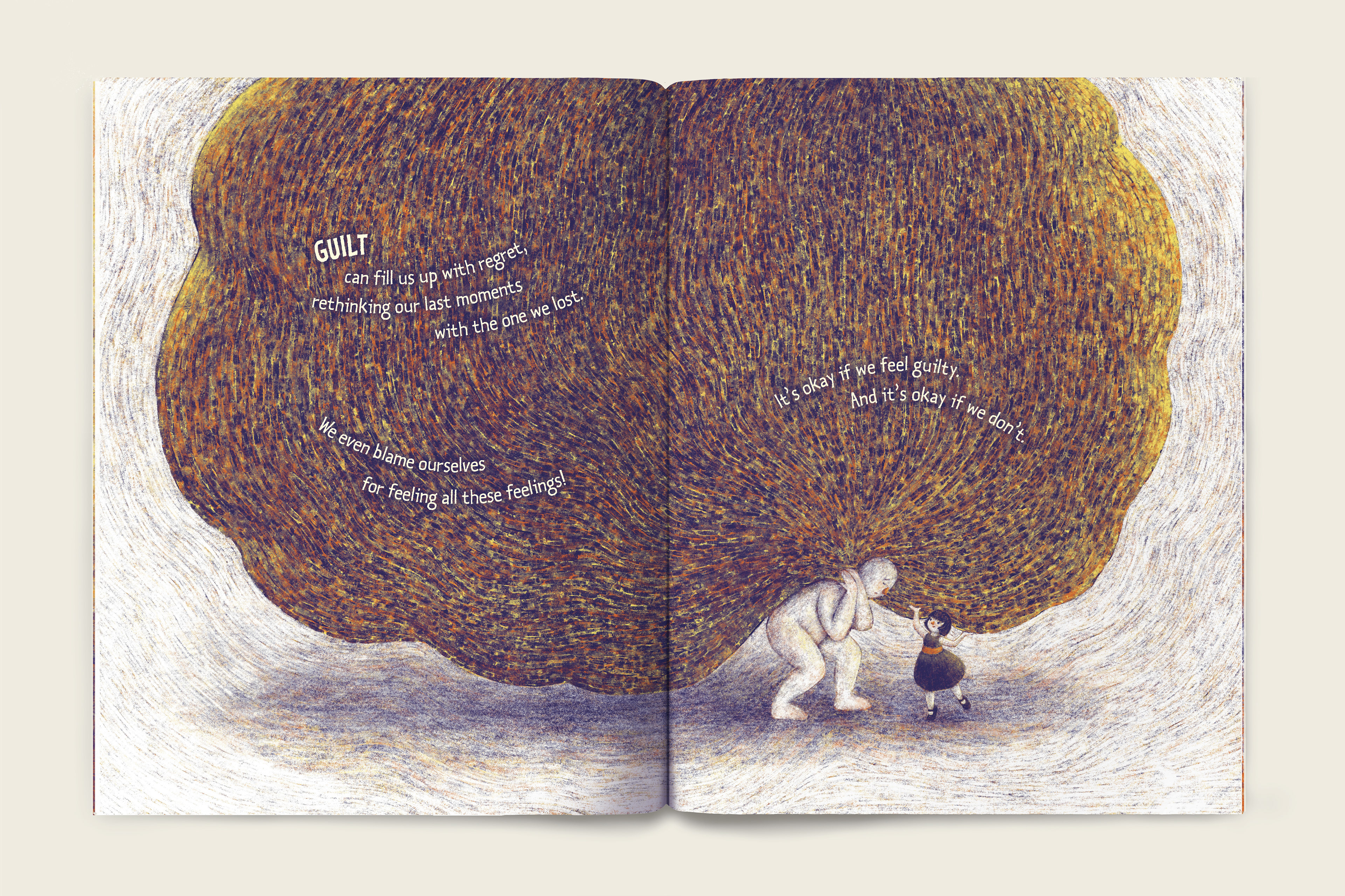 The book revolves around a little girl who lives in a heart shaped house. After loosing a loved one, she is visited by a big character who represents the feeling she will be hosting.