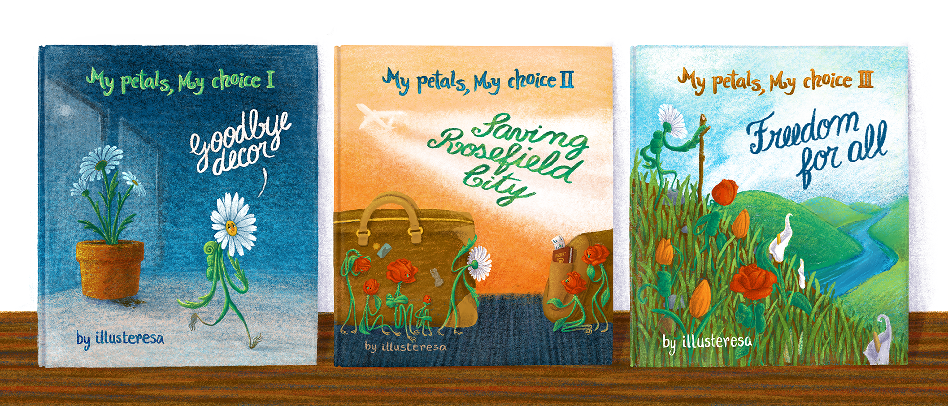 Made up trilogy on the adventures of a brave Daisy that decides to flee life as a decoration piece and sets off to travel the world and help others like her.