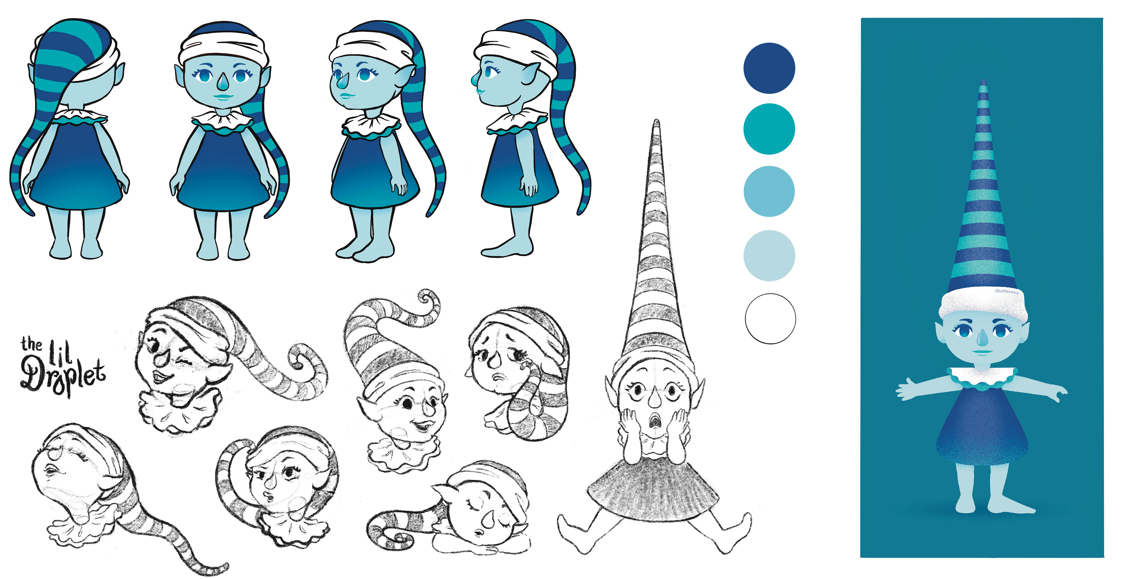 The idea behind this was that every drop in the book would wear a different hat while the main character's hat was the longest one and would feel like an integral and organic part of her personality and moods.